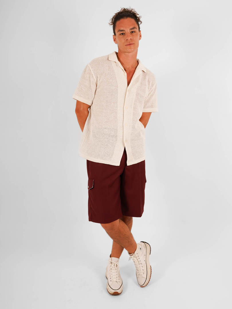 Ce bermuda cargo est confectionné en gabardine 100% coton et sublimé avec du biais en wax sur les rabats de poches.