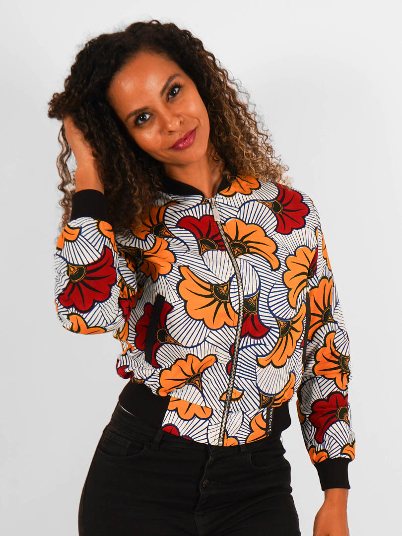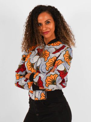 Ce bomber est confectionné en wax authentique, produit en Côte d’Ivoire et constitué à 100% de coton.
