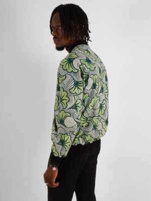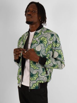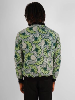 Ce bomber est confectionné en wax authentique, produit en Côte d’Ivoire et constitué à 100% de coton.