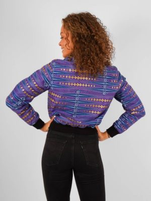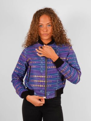 Ce bomber est confectionné en wax authentique, produit en Côte d’Ivoire et constitué à 100% de coton.