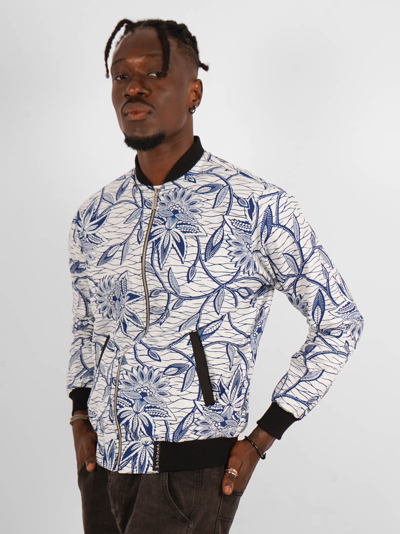 Ce bomber est confectionné en wax authentique, produit en Côte d’Ivoire et constitué à 100% de coton.