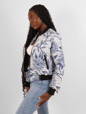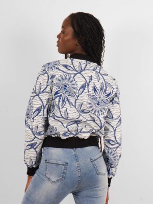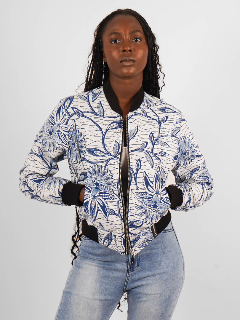Ce bomber est confectionné en wax authentique, produit en Côte d’Ivoire et constitué à 100% de coton.