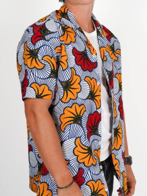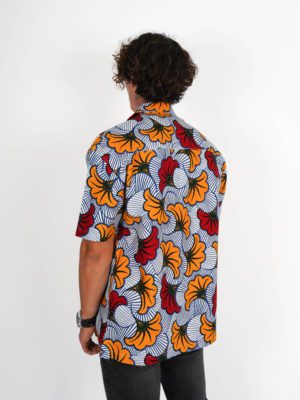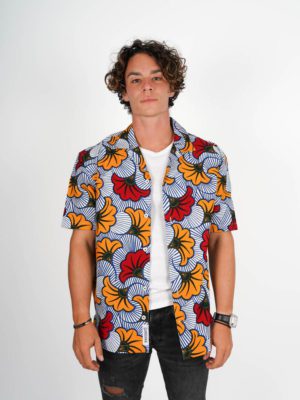 Cette chemise est confectionnée en wax authentique, produit en Côte d’Ivoire et constitué à 100% de coton.