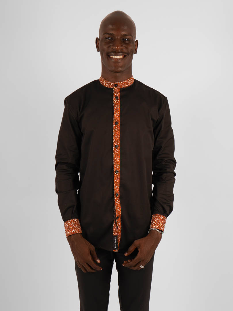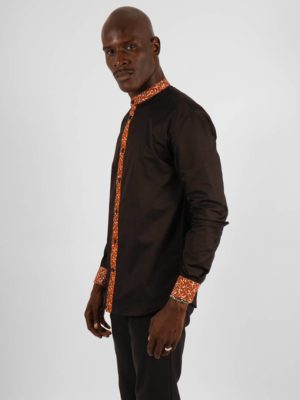 Cette chemise cintrée à manches longues tire son énergie d’un subtil mélange entre le wax et le coton unicolore.