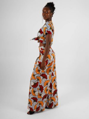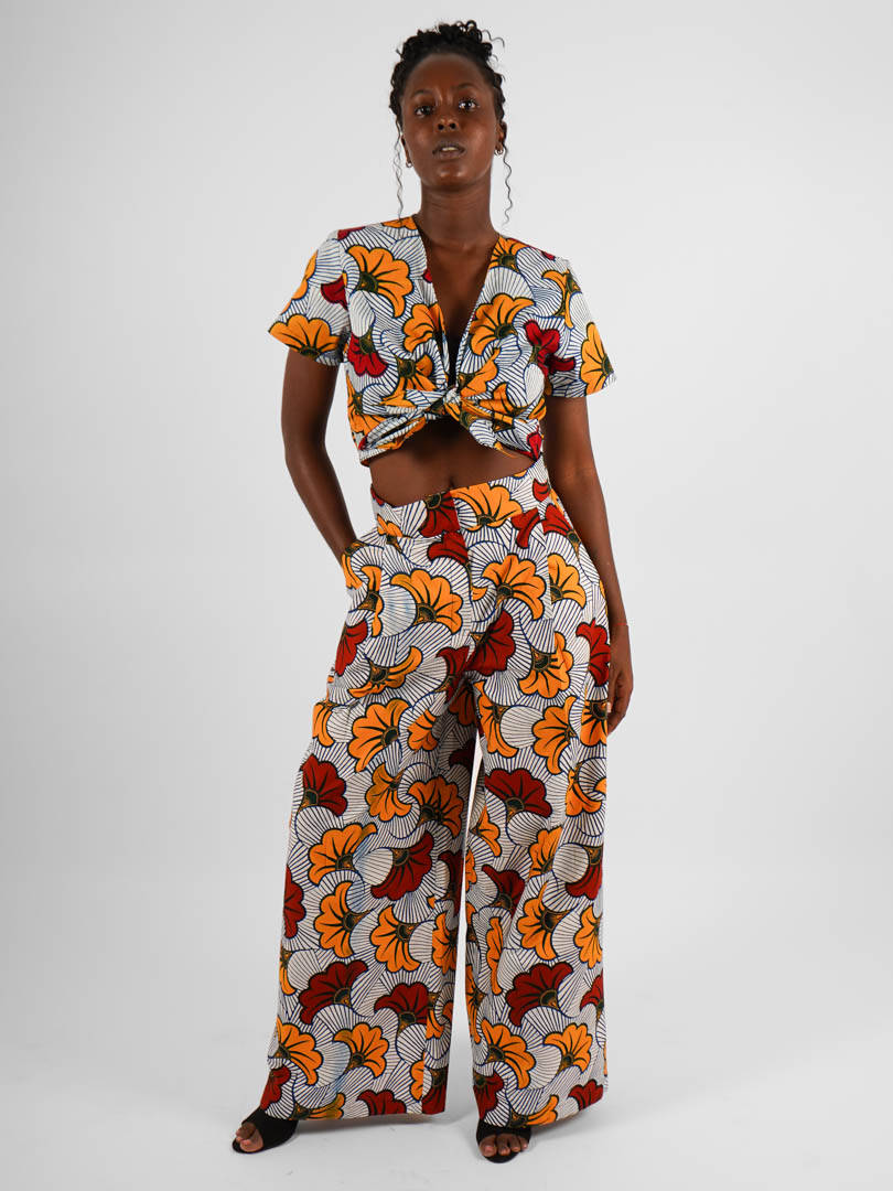 Ce pantalon ample à pinces est confectionné en wax authentique, produit en Côte d’Ivoire et constitué à 100% de coton.