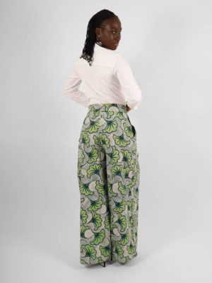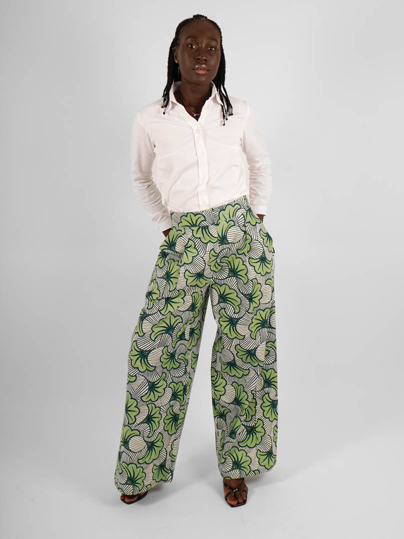 Ce pantalon ample à pinces est confectionné en wax authentique, produit en Côte d’Ivoire et constitué à 100% de coton.