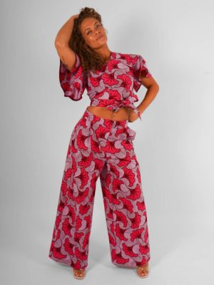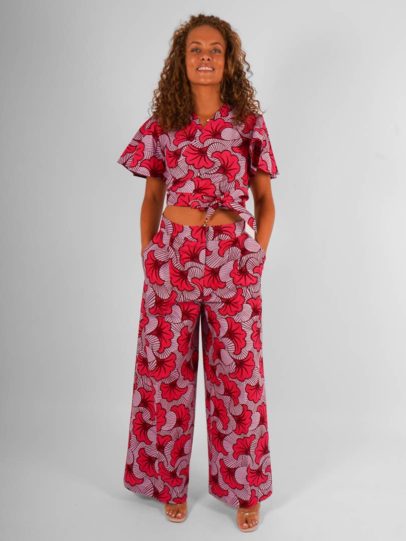 Ce pantalon ample à pinces est confectionné en wax authentique, produit en Côte d’Ivoire et constitué à 100% de coton.