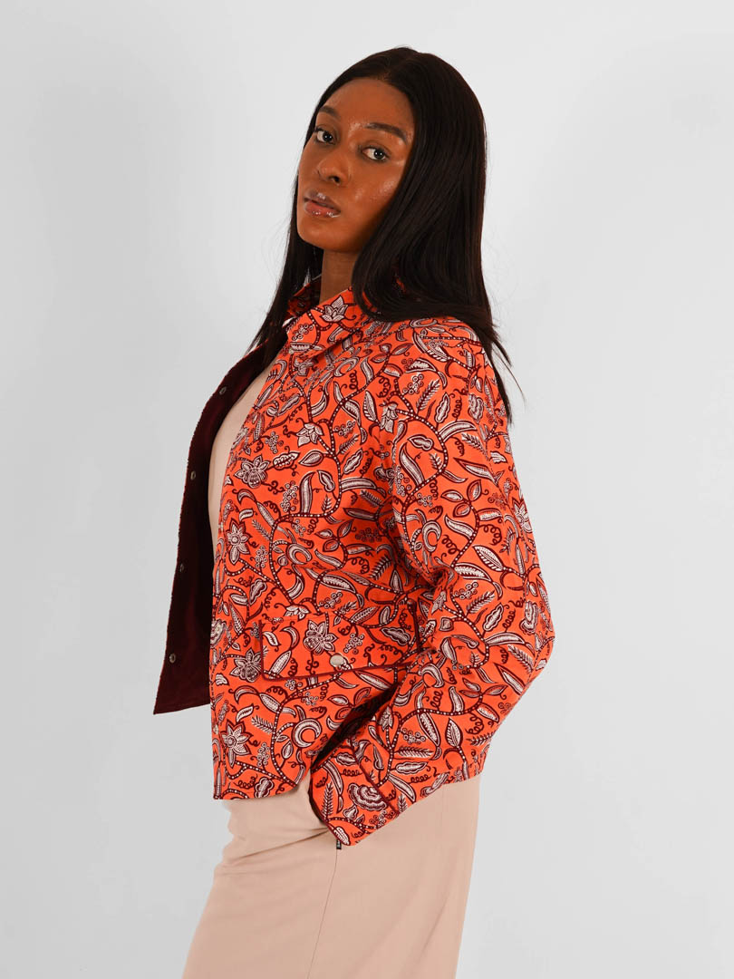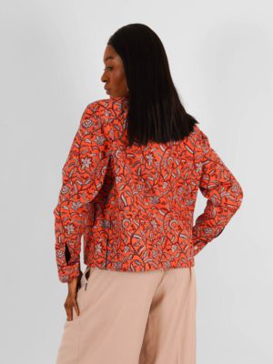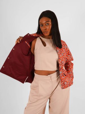 Cette veste légère est confectionnée en wax authentique, produit en Côte d’Ivoire et constitué à 100% de coton.